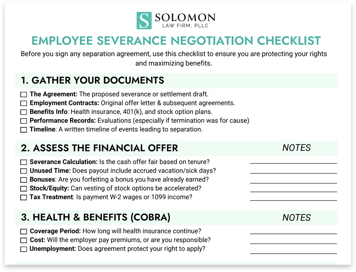 - Health & Benefits: Critical checks regarding COBRA premiums and unemployment eligibility.